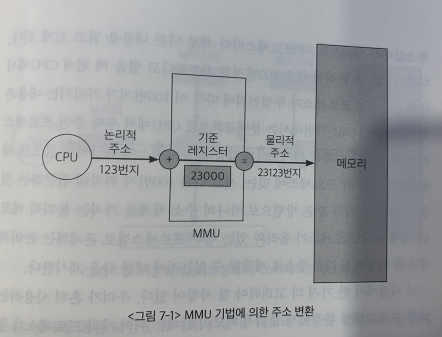 CPU가 특정 프로세스의 논리적 주소를 참조하고 싶을 때, MMU 기법은 그 주소 값에 기준 레지스터의 값을 더해 물리적 주소 값을 얻어낸다.